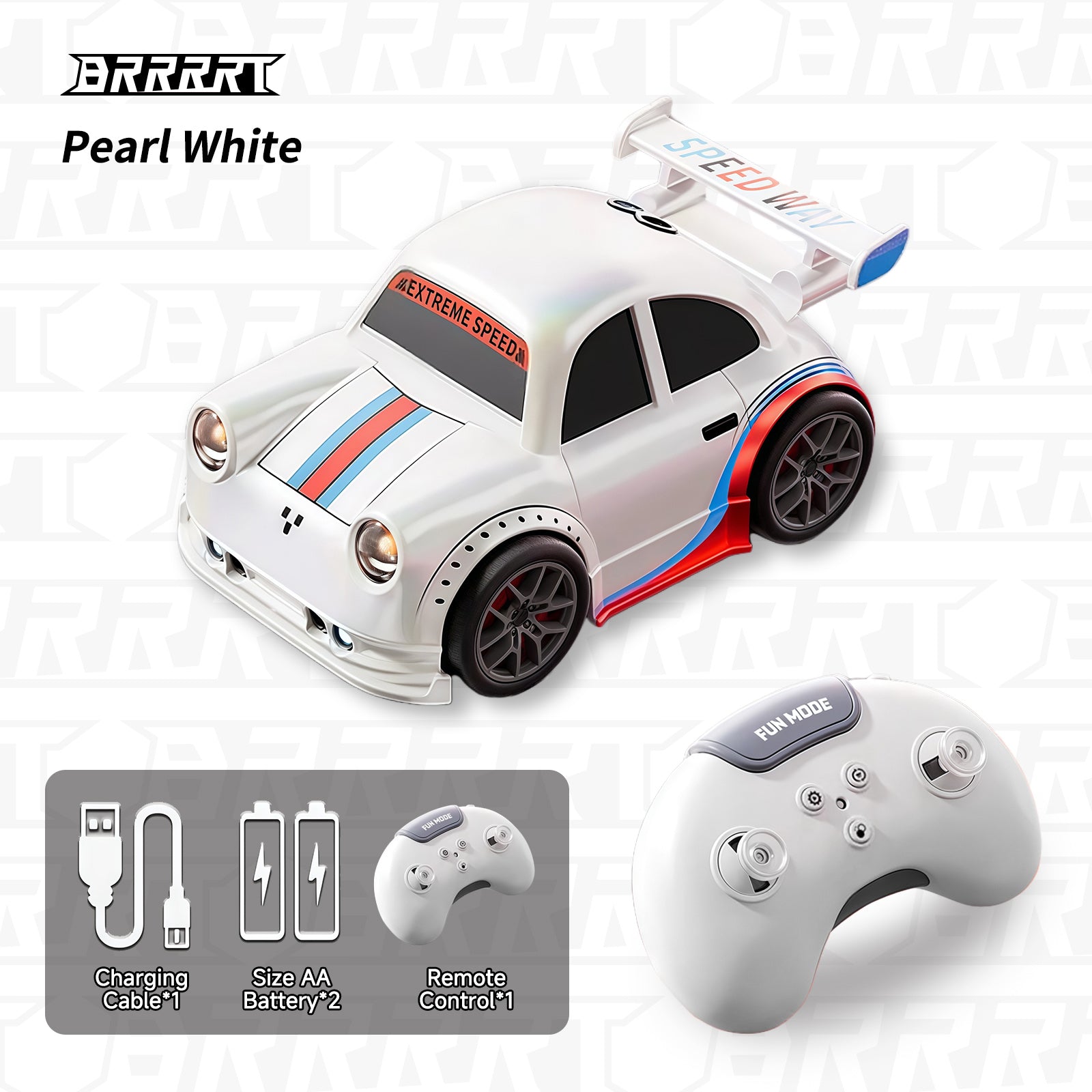 The BRRRRT Mini Smart Drift Car is a high-performance RC car available in black and white. It features dynamic decals, spoilers, and LED lights. With smooth drifting, Escape Mode, and Follow Mode, it offers an engaging, interactive experience.