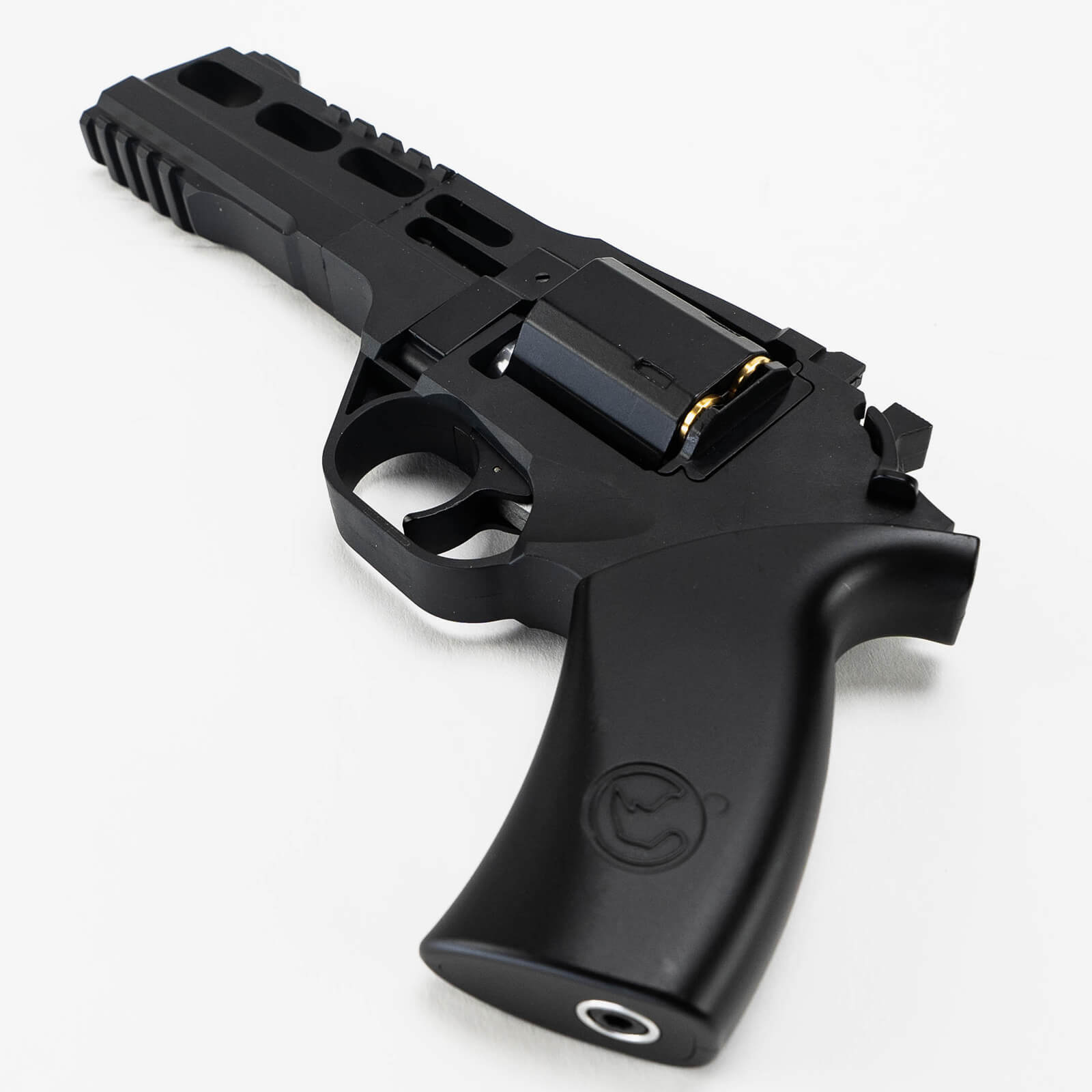Chiappa Rhino 60DS, çift etkili bir revolver dart blaster'dır, namlusunda ikonik chiappa gergedanı boynuzu şeklindeki ön işareti görebilirsiniz. Dayanıklı naylon ve ABS plastikten yapılmıştır ve metal bir kabukla 6 atışlık yumuşak mermileri tutabilen ve ateşleyebilen altı atışlık bir silindire sahiptir; genel gövde ağırlığı 780 g ve gövde uzunluğu 10,24 inçtir.